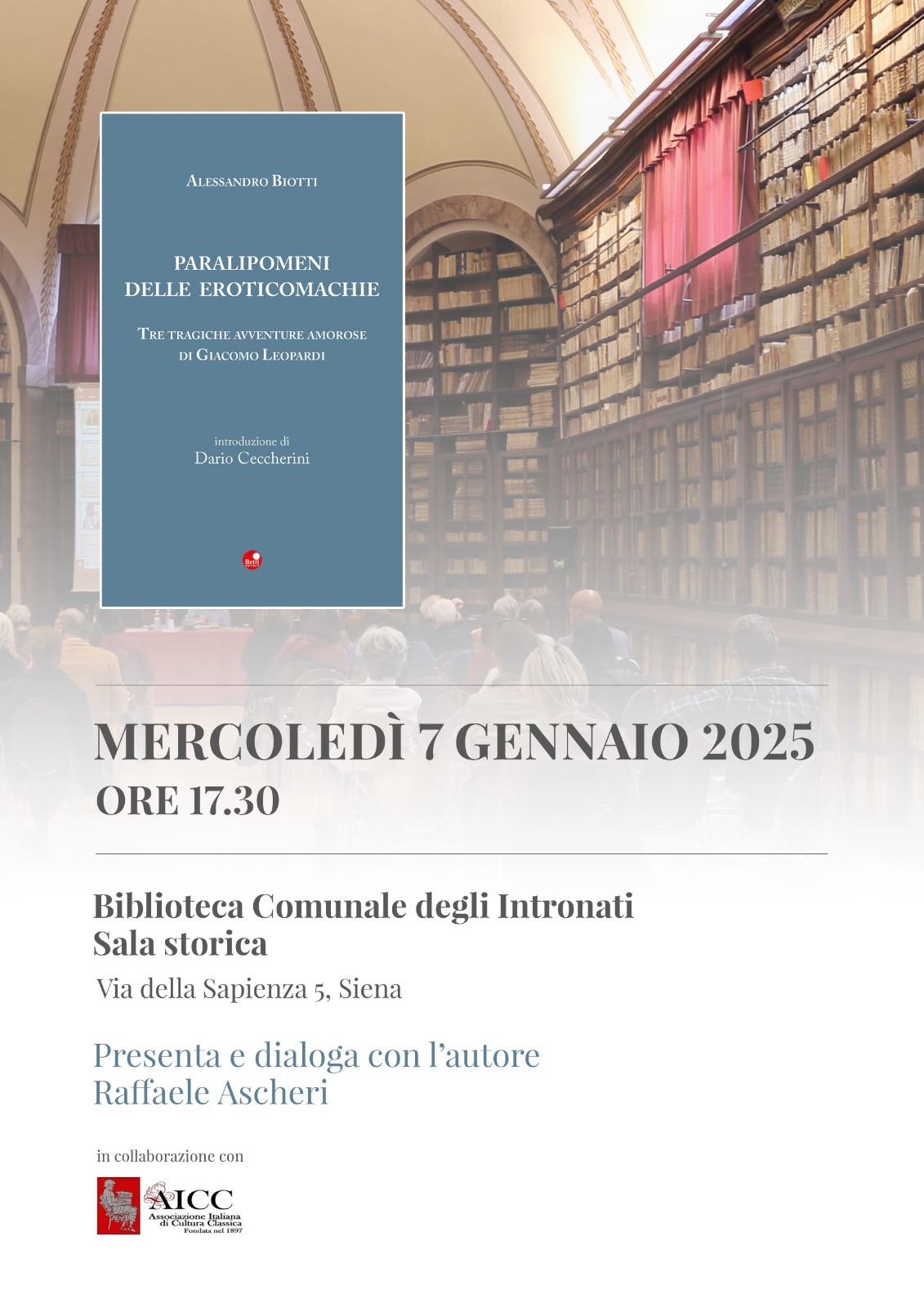 7 gennaio, ore 17,30 - Sala Storica della Biblioteca Comunale degli Intronati (Via della Sapienza, 5 - Siena) Presentazione del volume del prof. Alessandro Biotti, PARALIPOMENI DELLE EROTICOMACHIE. Tre tragiche avventure amorose di Giacomo Leopardi (ediz. Betti). Presenta e dialoga con l'autore Raffaele Ascheri.